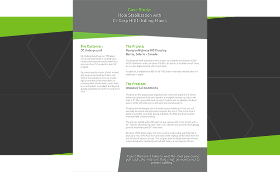 CC Underground partnered with Di-Corp, using a specially designed drilling fluid system including Wyo-Ben Extra High Yield Bentonite™, Earth Pro ProPac D™, and Prima-Seal™ to stabilize the borehole and maintain fluid balance throughout drilling and pipe pullback.